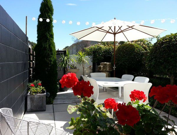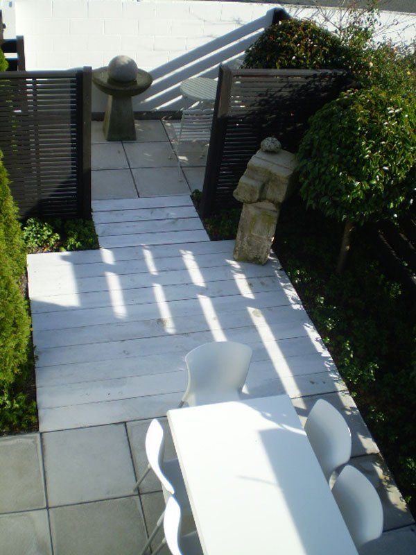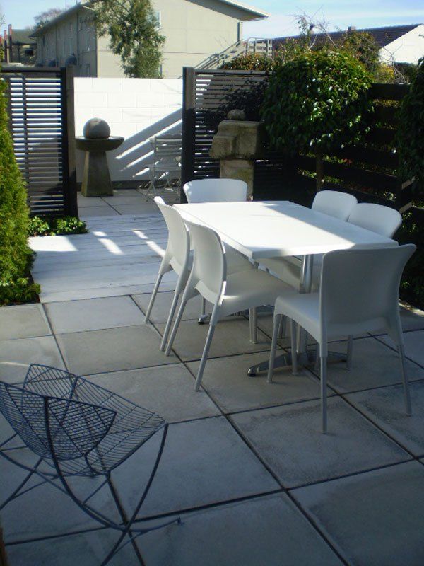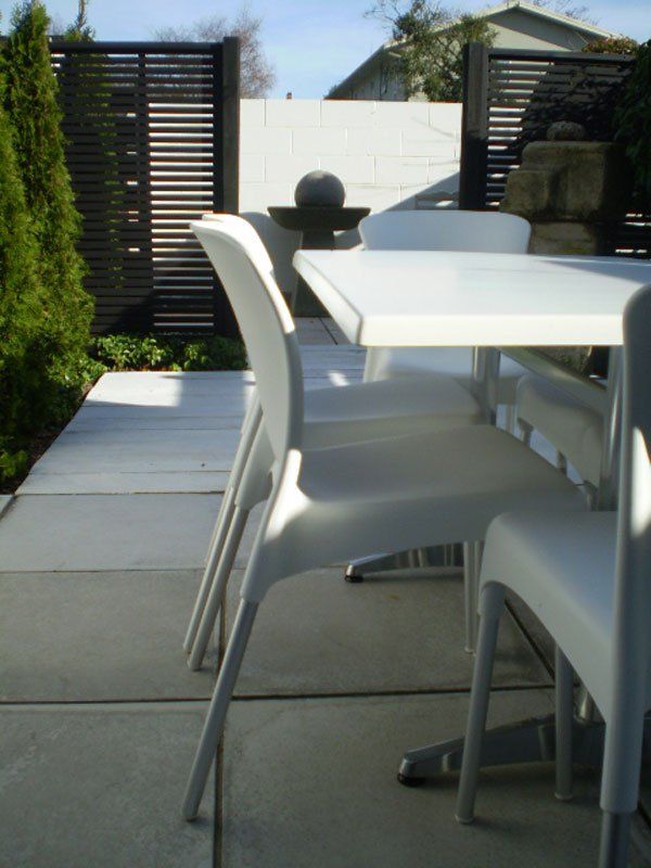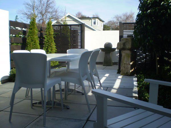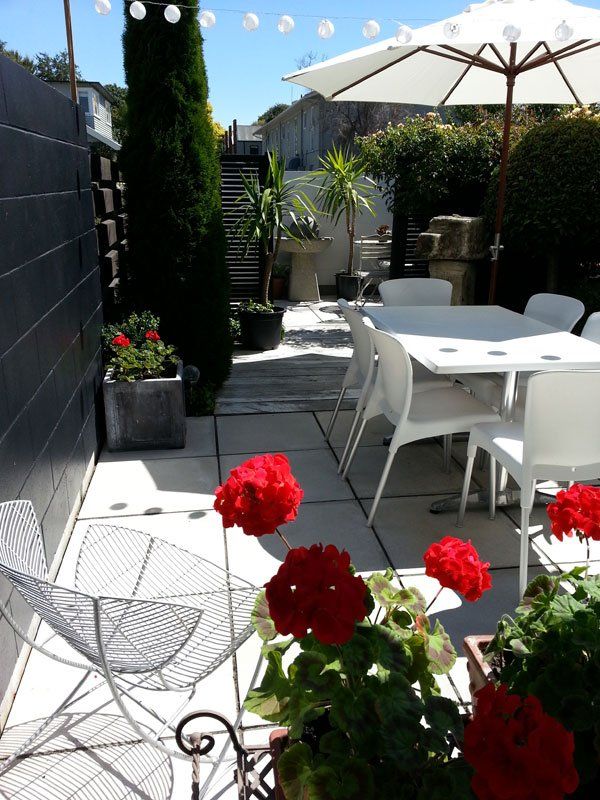 - The use of wooden Macrocarpa sleeper laid cross ways dividing the two paved areas created width to the narrowly proportioned site.