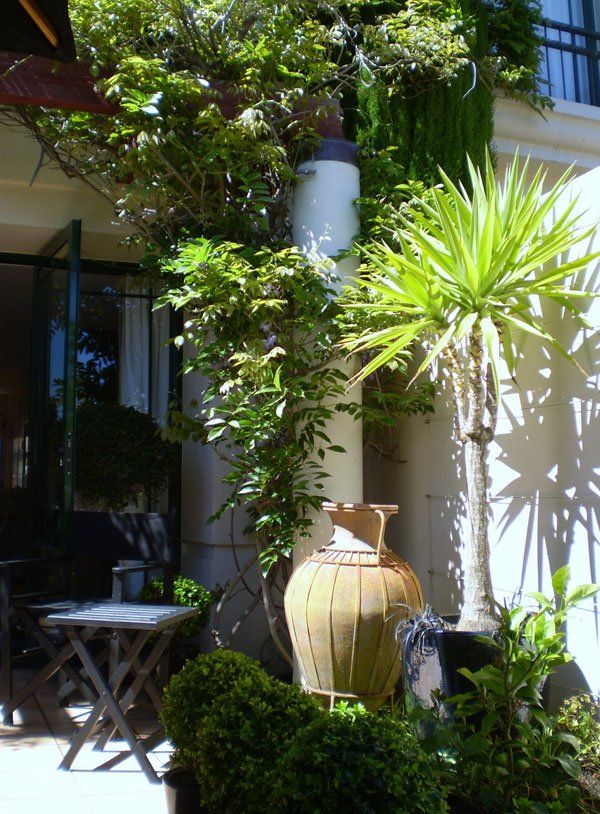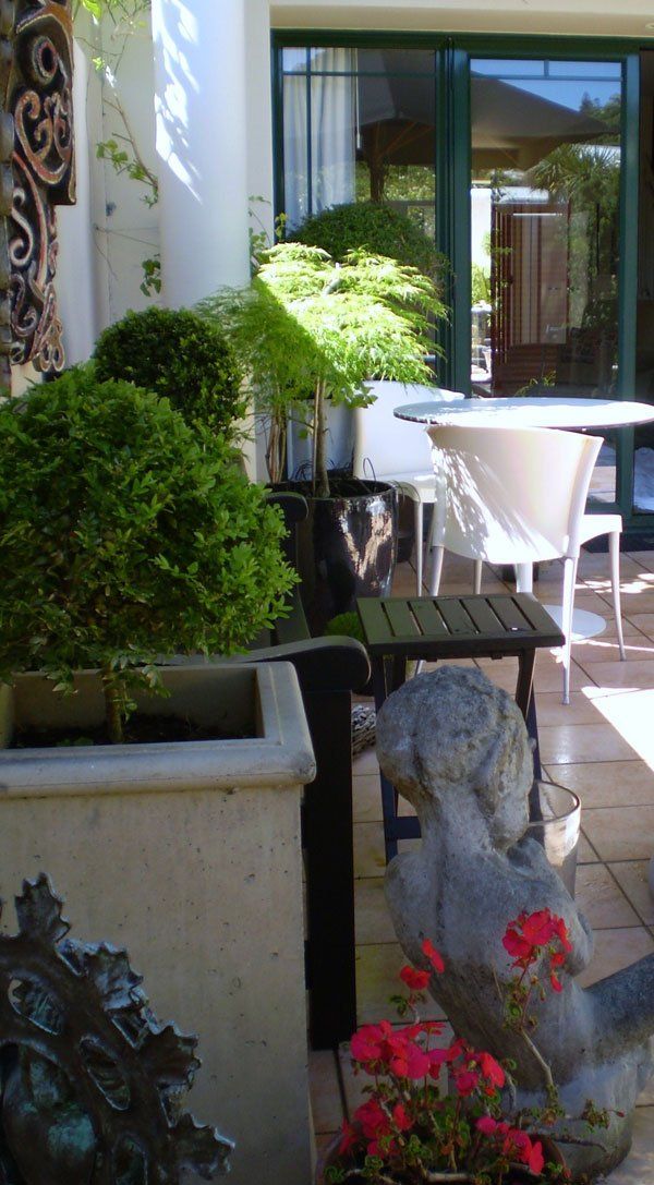 - Tranquility and coolness, punctuated by the dramatic has been successfully achieved, using a combination of layered luxuriant green foliage and striking architectural forms of planting.